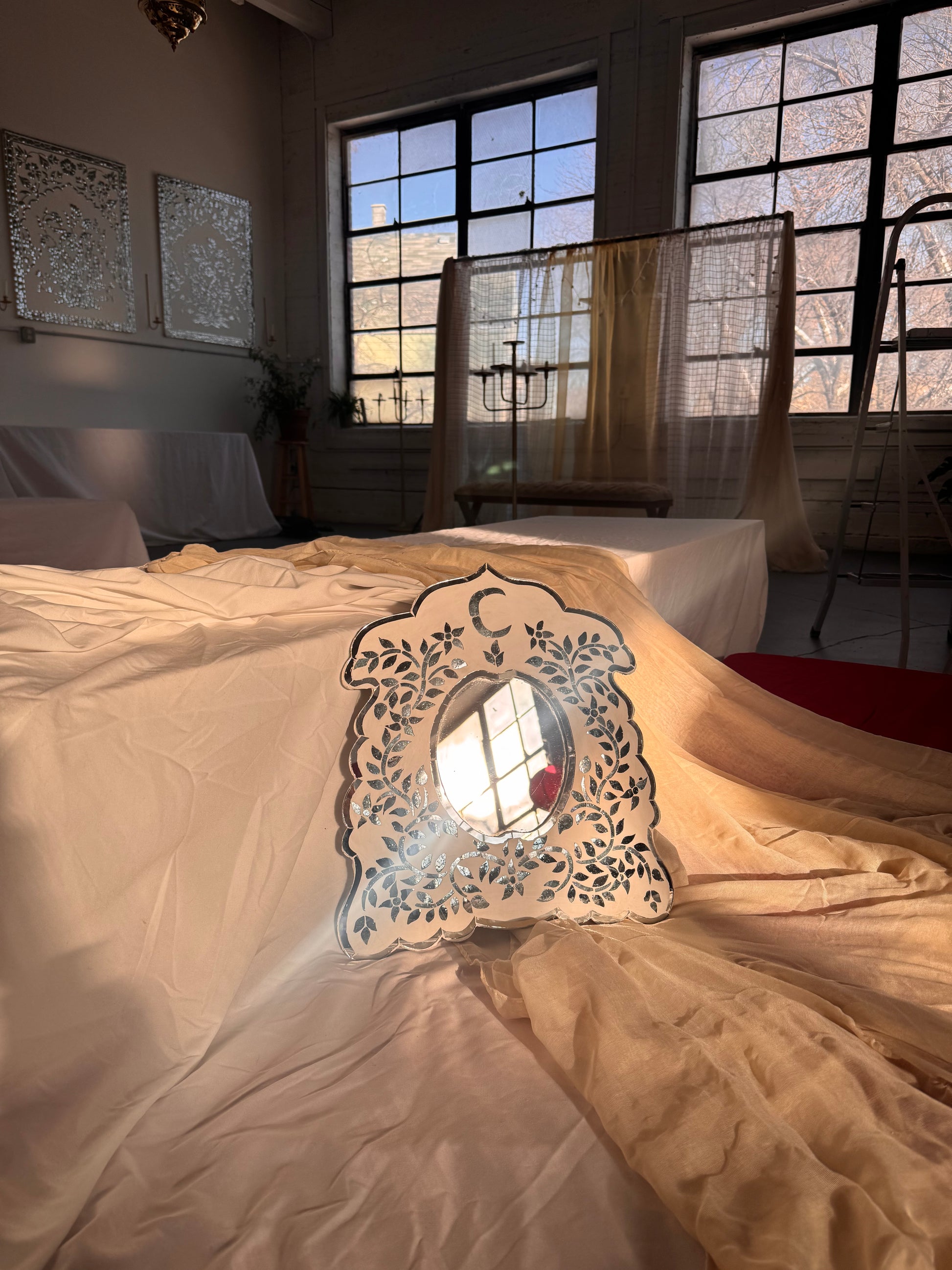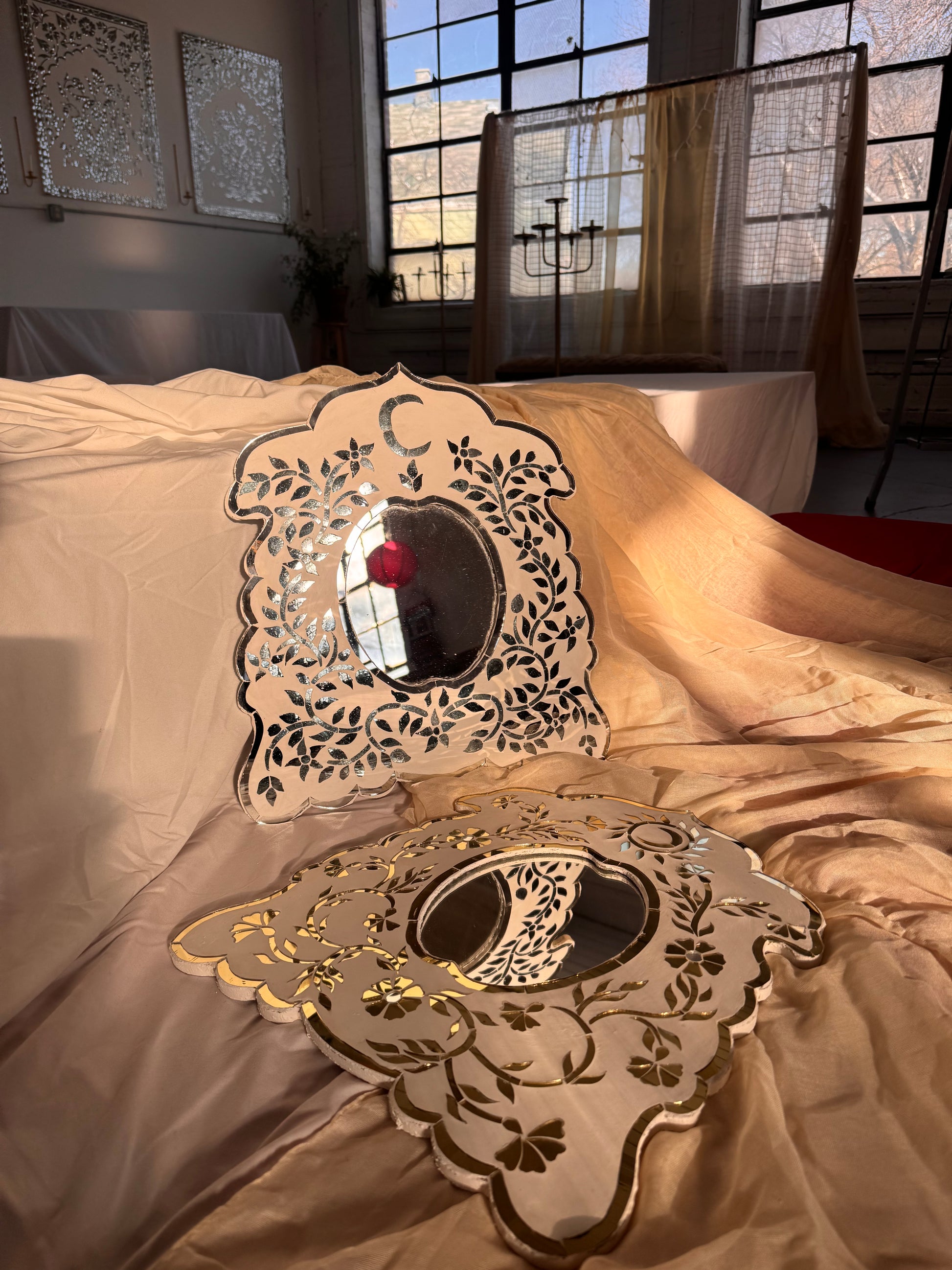 Designed by Balpreet and Eliza, this set holds both energies of light. The vibrant, warm, invigorating, buzzing, powerful sun with festive marigolds. The reflective, cool, mysterious, romantic moon with creeping jasmine.