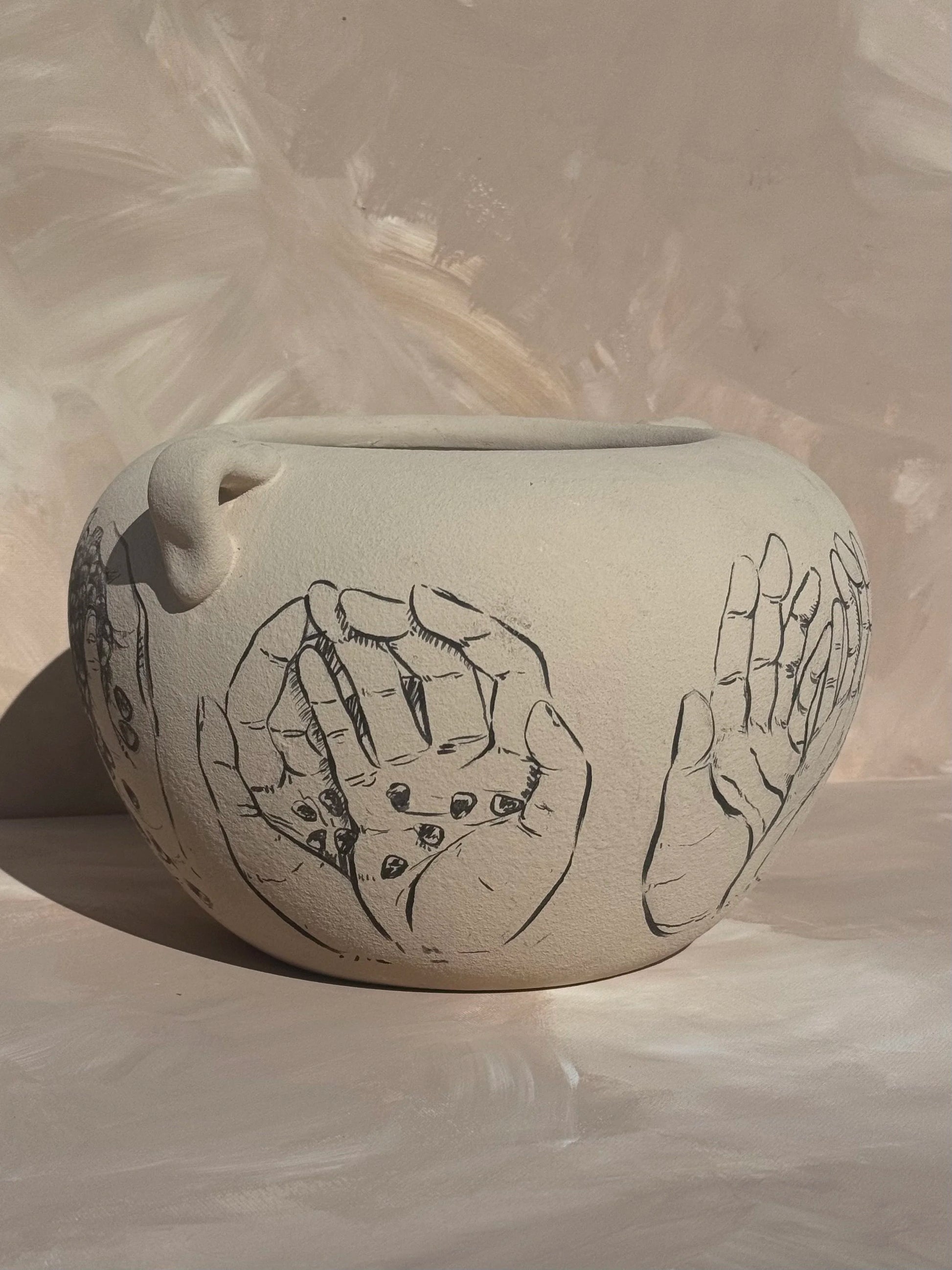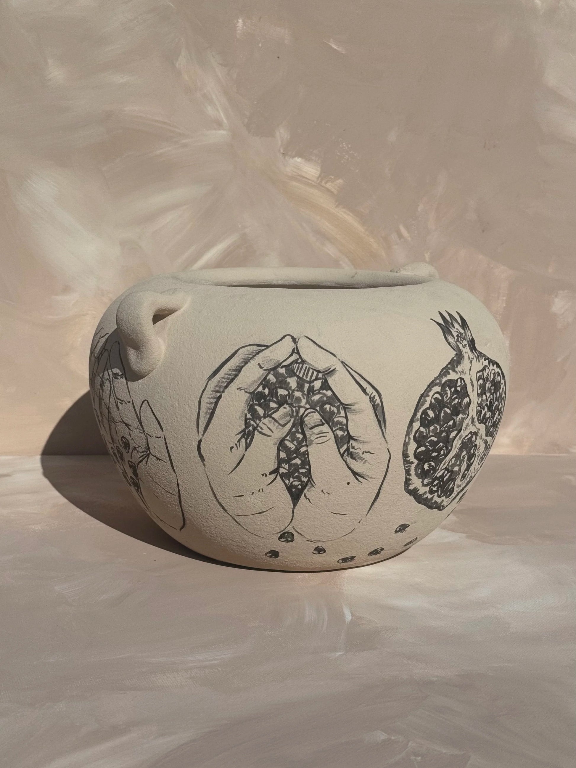 Hand painted images of prayer turning gradually into a pomegranate. Blessings upon blessings. Mortality. Abundance. Gratitude. Gradual answers to prayers.