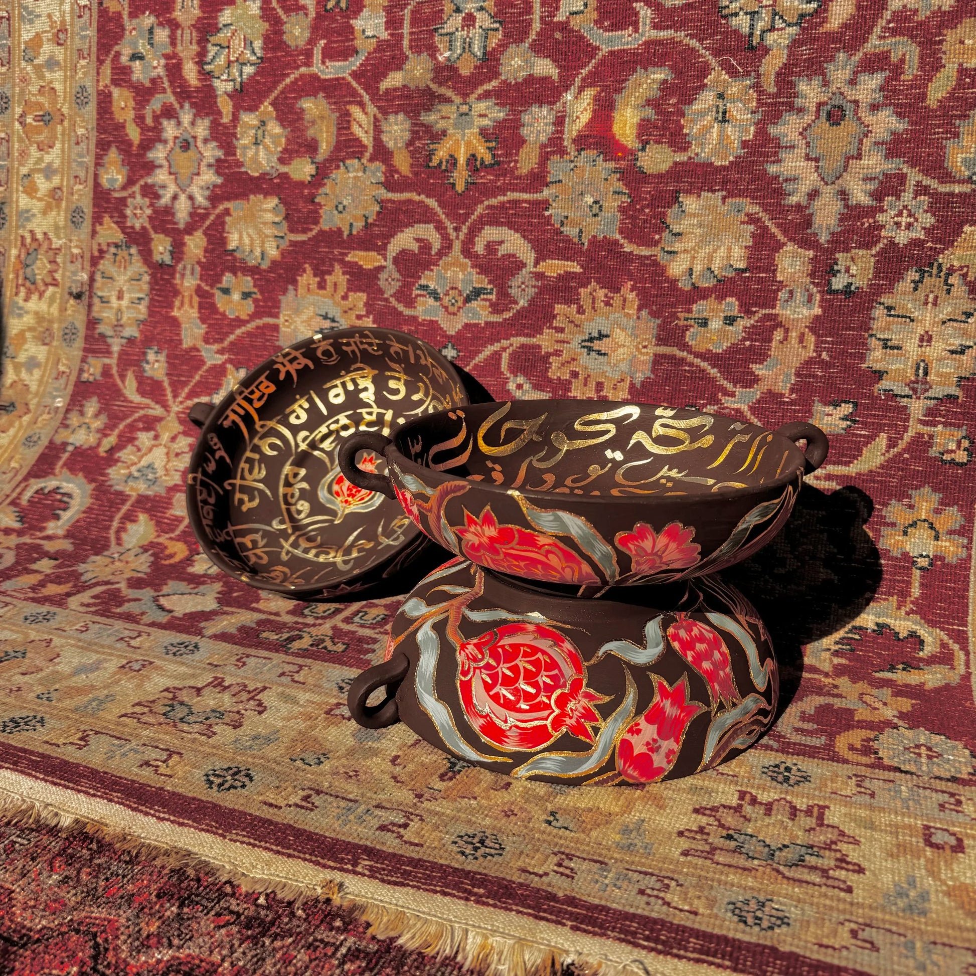 The pomegranate has many associations. Fertility, life, family, harvest, but in this tray, it calls to the myth of Persephone eating the forbidden fruit on her way out of the underworld. Waris Shah takes the place of a forlorn Heer replacing her center of the universe, her direction of worship, her God to her lover. Her forbidden fruit. Her Ranjha.