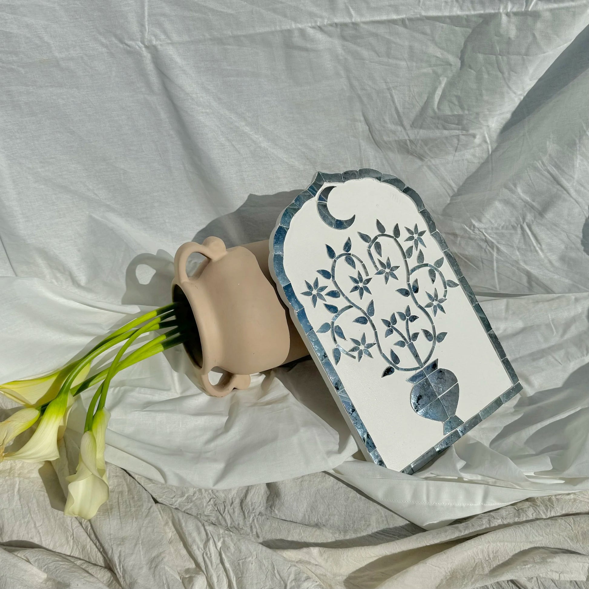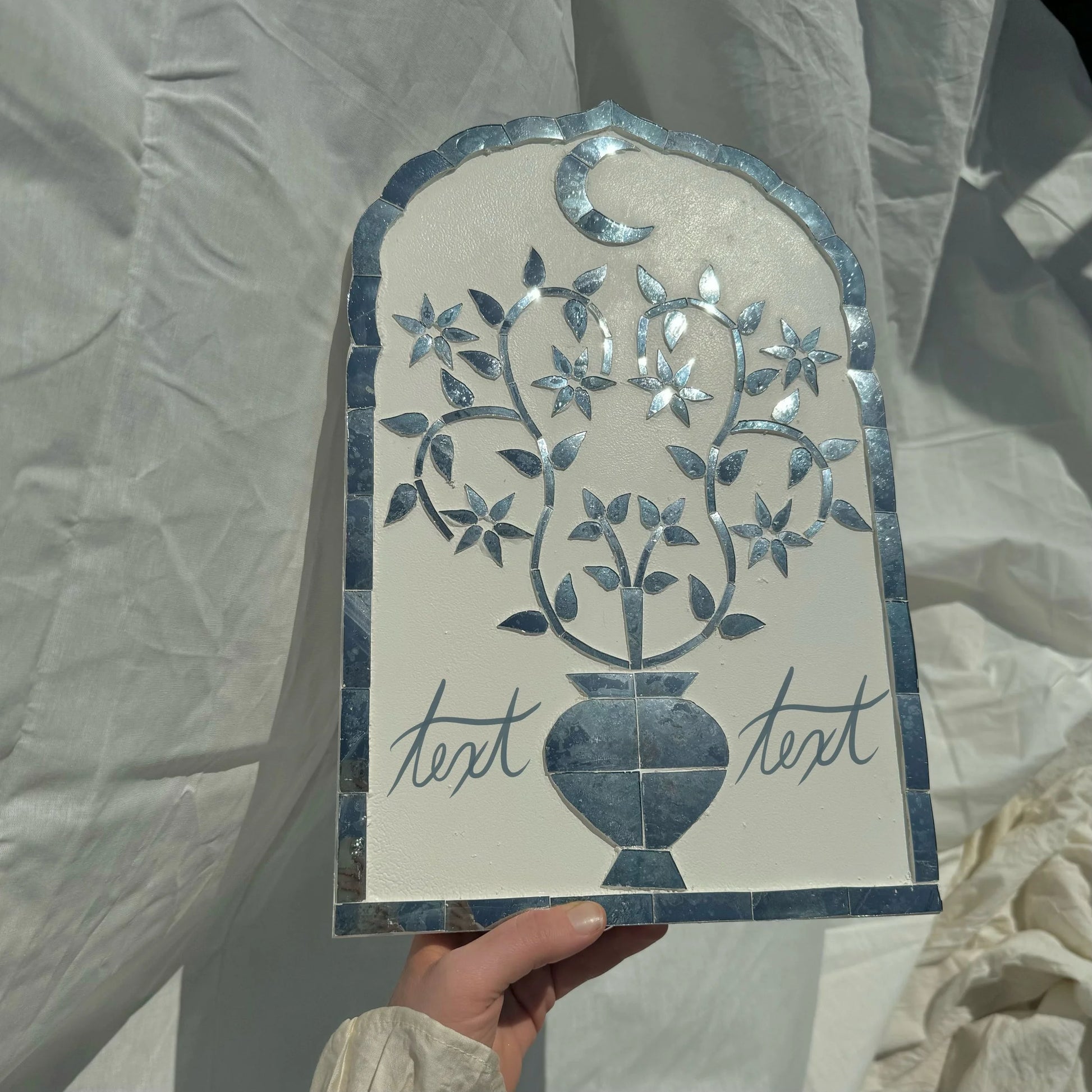 This arched mosaic, featuring hand-cut mirrored tesserae of a crescent moon and night blooming jasmine.