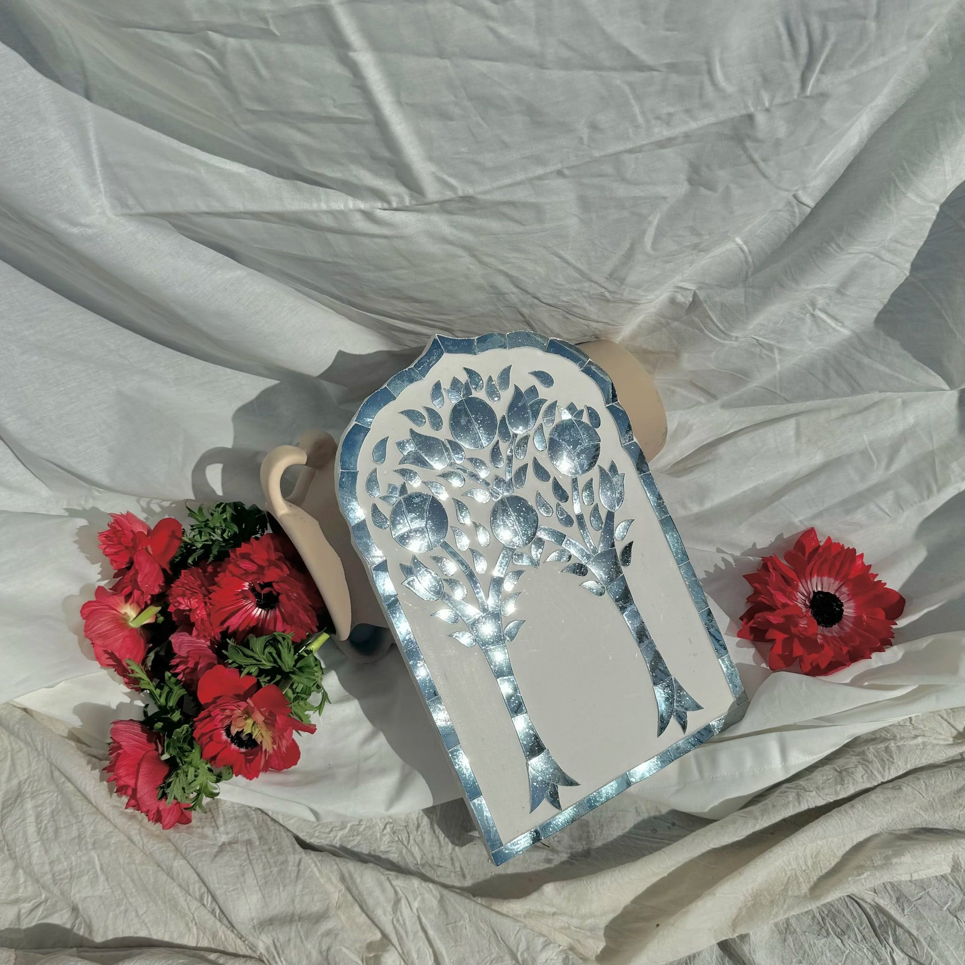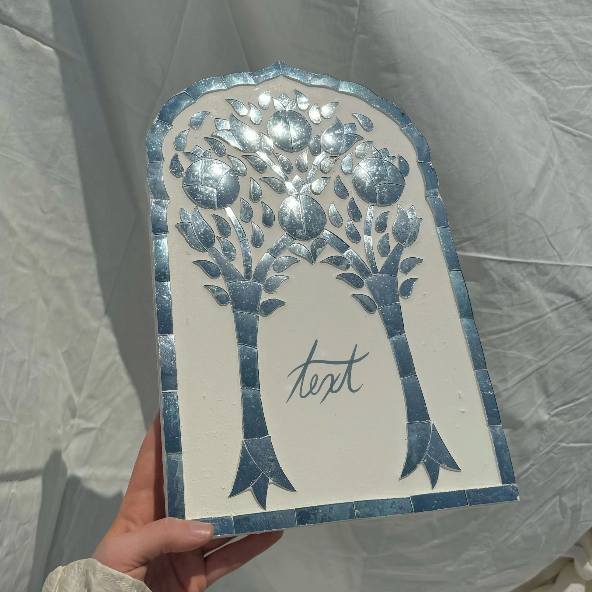 This arched mosaic, featuring hand-cut mirrored tesserae of two pomegranate trees uniting into one.